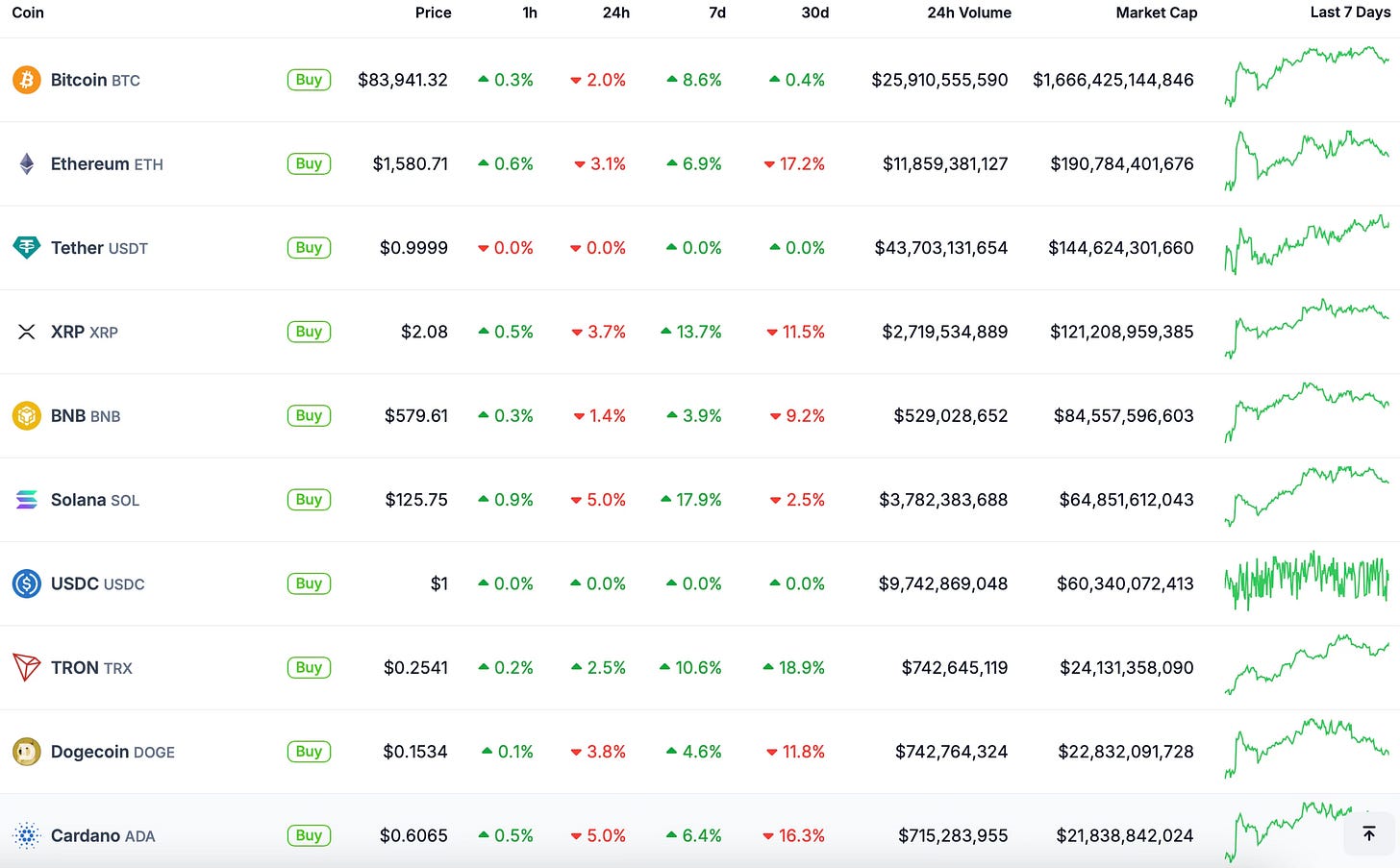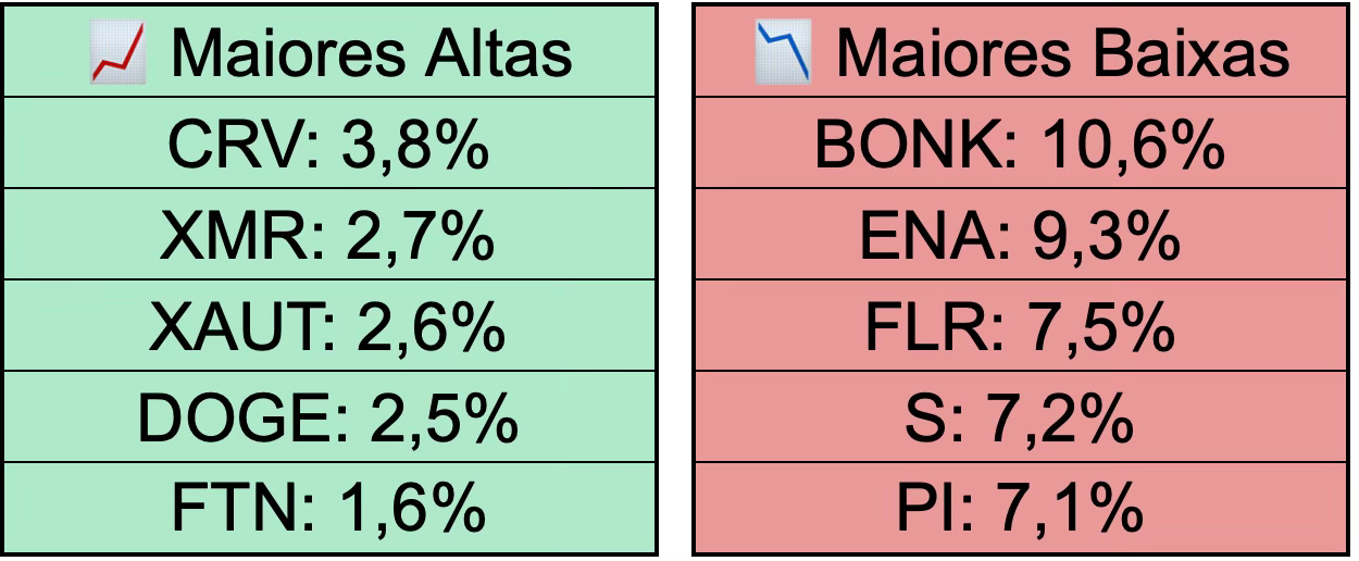 O Bitcoin (BTC) devolveu todos os ganhos registrados no dia anterior e abriu em queda de 2% nesta quarta-feira (16). A criptomoeda está cotada a US$ 83.900 e segue longe dos principais suportes. No Top 10, a maior queda ficou com a Solana (SOL), que perdeu 5%, e o destaque positivo foi a alta de 2,5% na Dogecoin (DOGE).