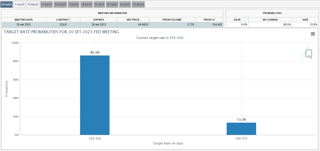 Apesar disso, hoje, a grande maioria do mercado (~87%) espera a manutenção dos juros na próxima reunião, de acordo com o CME Fed Watch Tool.