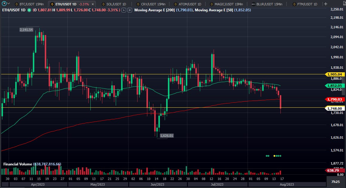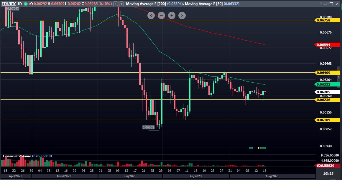 O Ethereum, por sua vez, está com um movimento de preços mais lateral, desde abril/23, negociando, majoritariamente, entre a região de U$1.750-1.900. Além disso, o ativo está testando um nível de preço importante, em cima de sua EMA de 200 períodos. Se perdido, o próximo ponto que merece atenção é a zona inferior de preços da lateralização, onde pode-se abrir boas oportunidades de compra.