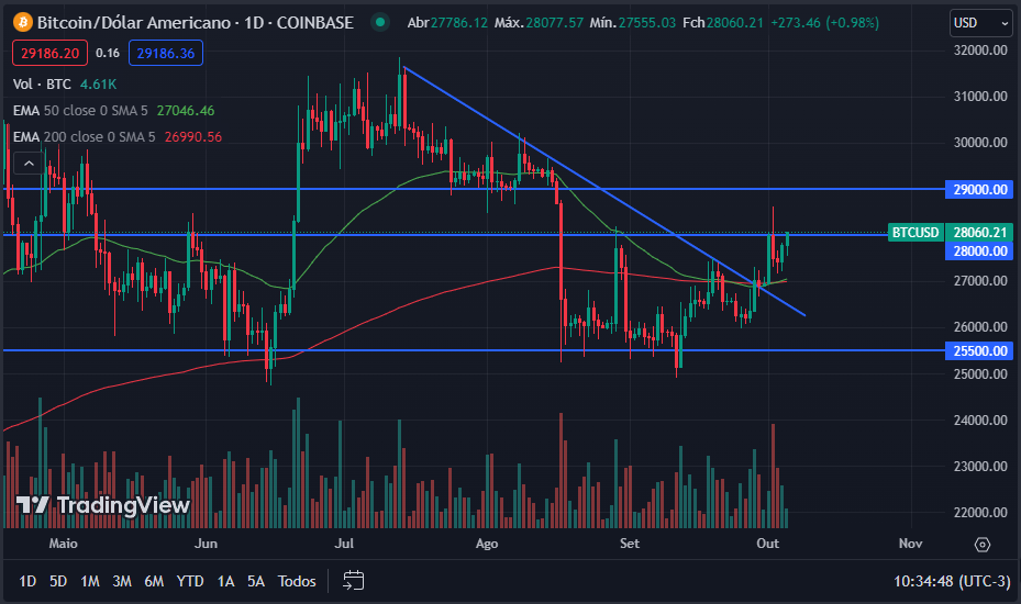 Por outro lado, a falha em ultrapassar os U$28 mil pode levar o ativo de volta para suas médias móveis longas (EMA50 e EMA200 - linhas verde e vermelha no gráfico abaixo), próximas da região dos U$27 mil, que aparenta ser o primeiro suporte de preços relevante.