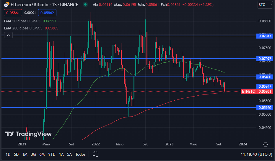 Com isso, a razão ETHBTC fez novas mínimas de preço e atingiu o patamar de 0,0586. Dito isso, vale ter atenção a região entre 0,052-0,058, que aparenta ser uma zona interessante para acumulação no gráfico semanal.