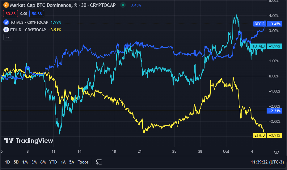 Com o movimento, a dominância do Bitcoin (BTC.D), voltou a superar o patamar de 50%, o que indica a preferência dos investidores pelo ativo em consideração aos demais.