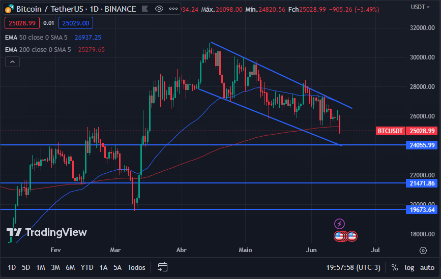 Agora, abre-se caminho para o teste na região dos U$24 mil que, se perdidos, pode levar o ativo para zonas de preço mais baixas. Caso o BTC consiga se recuperar, os U$26 mil deve ser a primeira resistência para se acompanhar.
