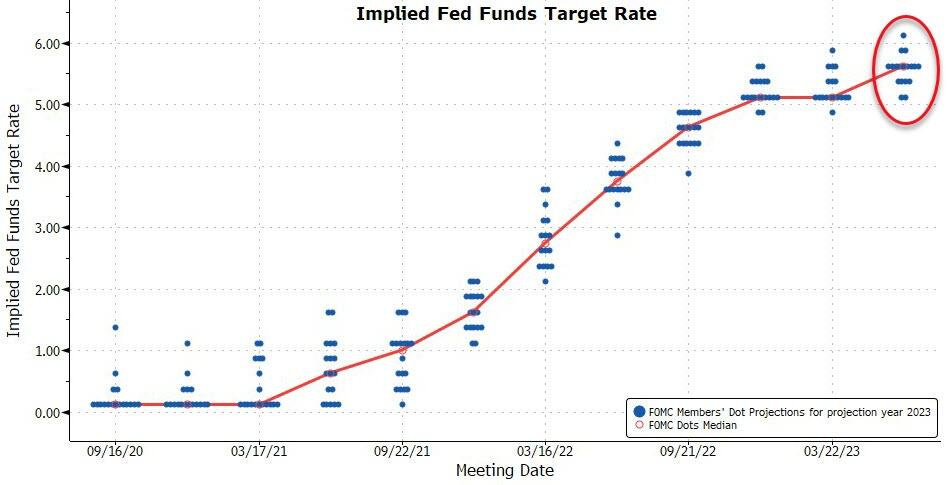 Nela, atentou-se bastante às expectativas dos membros do FED com relação às taxas de juros no fim de cada ano. Na pesquisa anterior, a grande maioria esperava que a taxa terminal de juros em 2023 seria próxima de 5,1% a.a. Já na pesquisa atual, esse valor saltou para 5,6%, a.a. um aumento extremamente relevante, de 50bps.