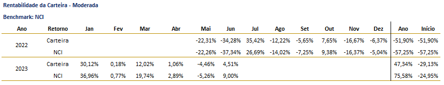 Já a carteira moderada obteve um rendimento de +4,51%, contra +9,00% do NCI.