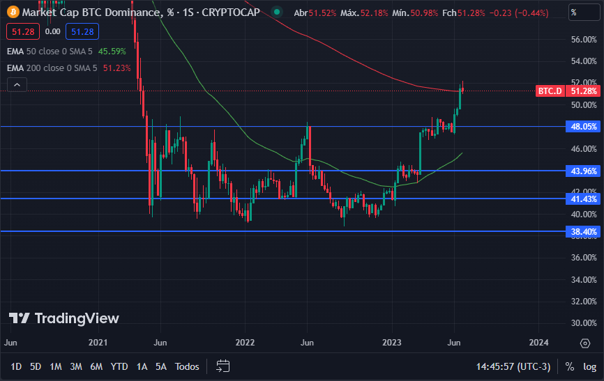 Fazendo uma análise mais detalhada da performance do mercado cripto, observou-se mais um mês de destaque do BTC frente ao ETH e demais altcoins. A dominância do Bitcoin (BTC.D) - métrica que mede a razão de capitalização de mercado do BTC pela capitalização de todo o mercado cripto - por exemplo, atingiu os 52%, patamar que não era alcançado desde abril/21.