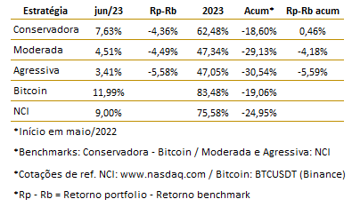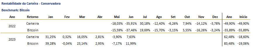 A carteira conservadora, no mês de junho, obteve um resultado de +7,63%, enquanto o Bitcoin teve rentabilidade de +11,99%.
