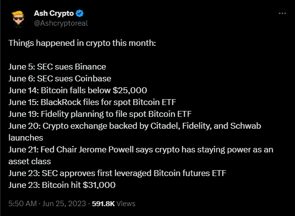 Para finalizar, o tweet abaixo resume bem a cronologia dos eventos de movimentaram o mês de junho. Vale lembrar que comentamos sobre todos esses eventos em nossos relatórios, lives e canais exclusivos dos assinantes do BG Cripto PRO.