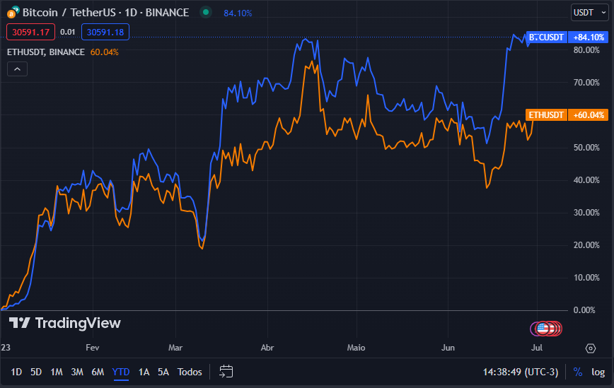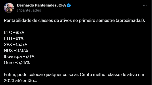 Com essas performances, o Bitcoin se consolida como o melhor ativo do primeiro semestre de 2023, bem a frente do segundo colocado (Nasdaq: NDX), que também apresentou um dos melhores semestres de sua histórica, valorizando +37%.