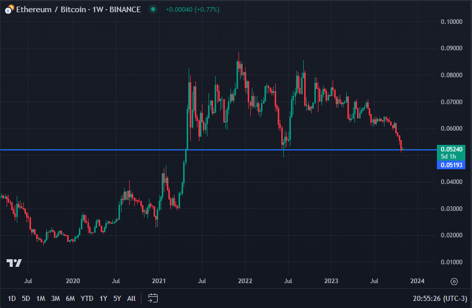 Dito isso, também é importante avaliar o movimento dos demais criptoativos no último mês, em especial, o Ethereum. Apesar de ter se valorizado também de forma expressiva no período (+51% no ano), sua performance ficou muito aquém a do Bitcoin, o que fez, mais uma vez, a razão ETHBTC apresentar forte queda.