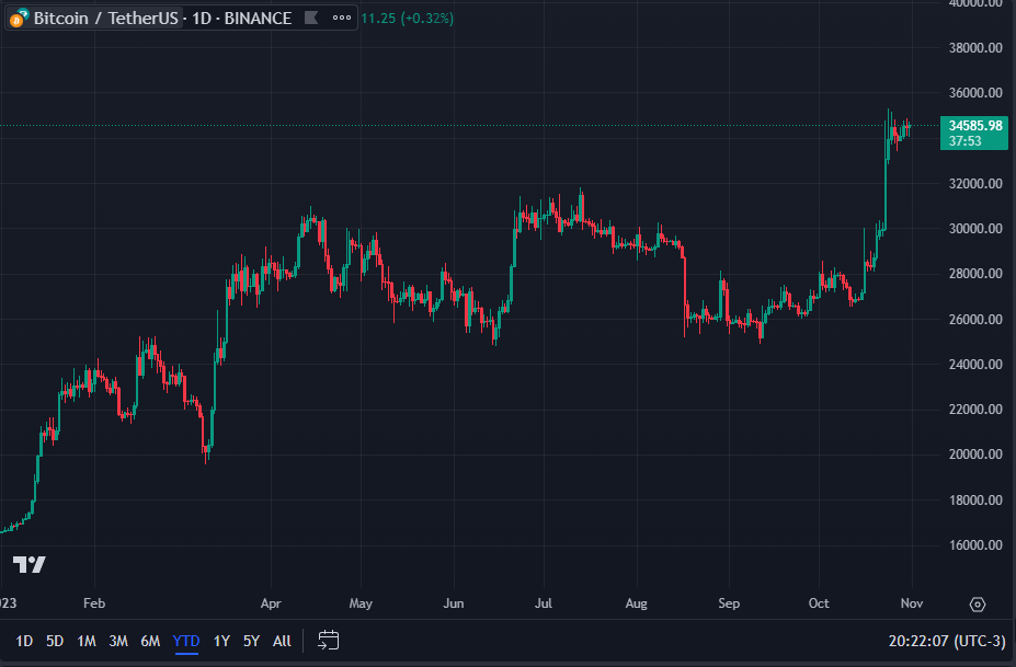 O primeiro fator que colabora com essa visão ocorreu no dia 13/out, quando foi divulgada notícia de que a Comissão de Valores Mobiliários Americana (SEC), não iria apelar contra a decisão envolvendo o seu processo com a Grayscale, o que aumentou a probabilidade de uma decisão positiva ao caso e, consequentemente, possível conversão do GBTC em um produto à vista (spot). Além disso, poucos dias depois, uma “fake news” divulgada pelo CoinTelegraph movimentou severamente os preços. O portal de notícias divulgou, sem as devidas confirmações, que o pedido do ETF Spot de BTC da BlackRock foi aprovado mas, apesar de ser uma informação falsa, tomou toda a atenção do mercado, e fez com que o Bitcoin iniciasse a sua trajetória dos U$27 mil até os U$35 mil, acumulando alta de +28% no mês. No ano, o ativo já acumula alta de +109%.
