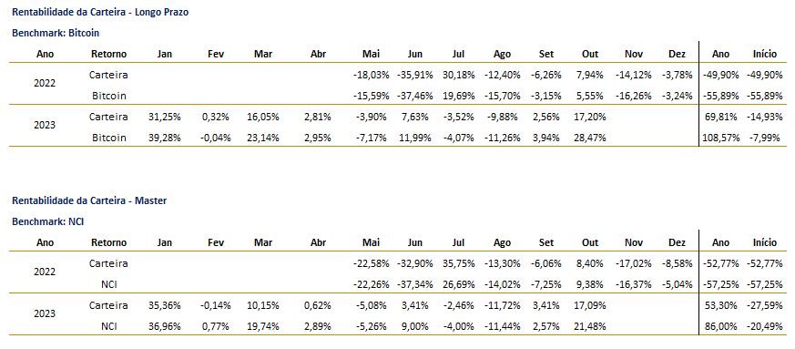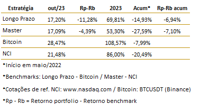 No mês de outubro, a Carteira Master e a Carteira Longo Prazo tiveram desempenhos inferiores aos seus respectivos benchmarks, o que pode ser justificado pela fraca performance do Ethereum na comparação relativa.