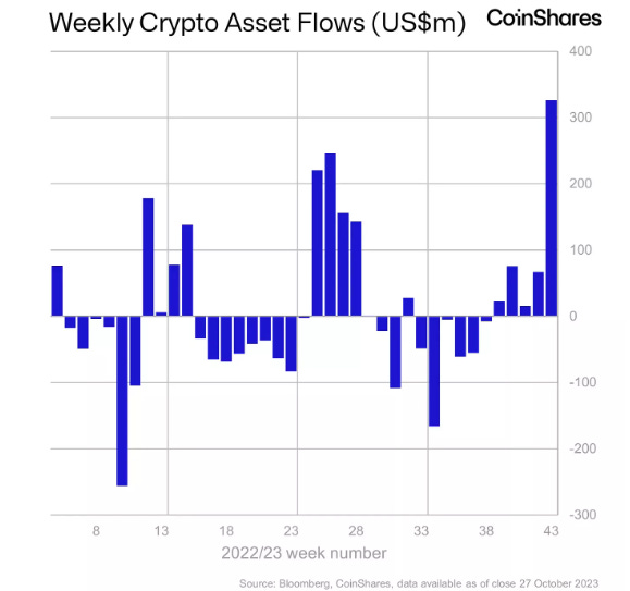 Outro fator que merece atenção fica para o fluxo financeiro para os ativos digitais. De acordo com a Coinshares, que atualiza esses dados semanalmente, a última semana de outubro trouxe o maior fluxo financeiro para esses produtos desde julho/22, totalizando U$326 milhões.