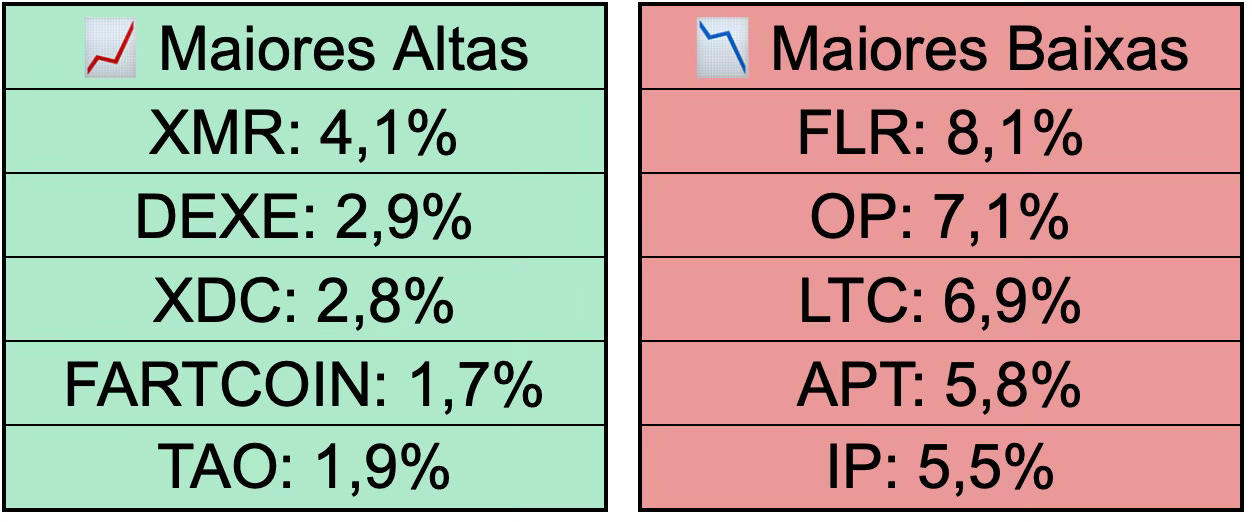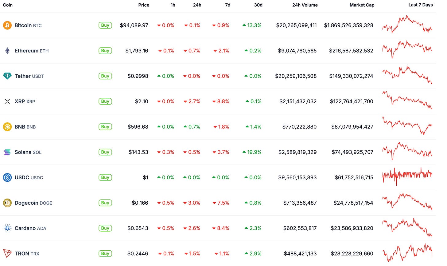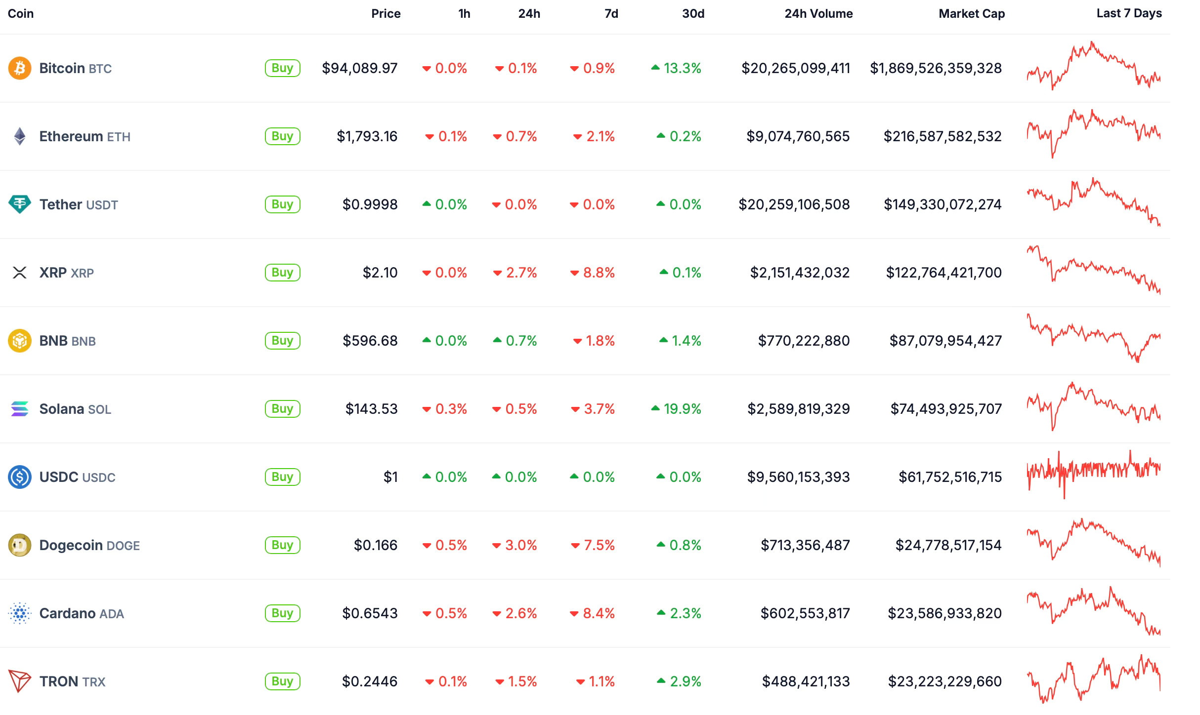 O Bitcoin (BTC) abriu o dia estável e se manteve acima de US$ 94.000 enquando a Dogecoin (DOGE) caiu 3% e liderou as perdas do dia. A única valorização do Top 10 foi a BNB, cujo preço teve leve alta de 0,7%.