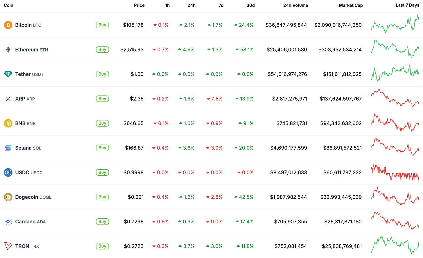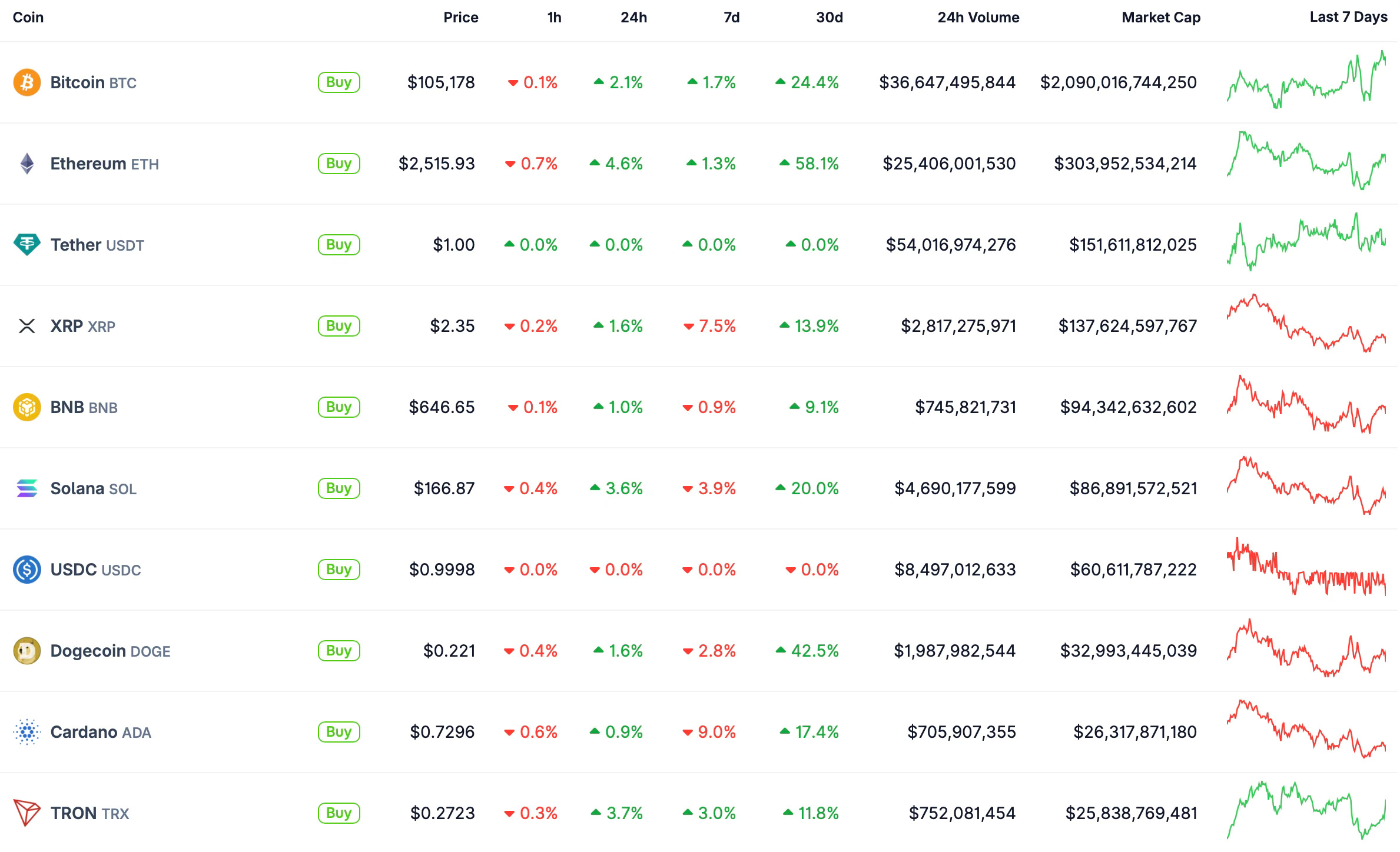 Depois da queda de ontem (19), o Bitcoin (BTC) se recuperou e voltou aos US$ 105 mil. A criptomoeda teve alta de 2,1% nesta terça-feira (20), enquanto o preço do Ethereum (ETH) subiu 4,6% e teve o maior ganho do dia no Top 10. Em seguida veio a Solana (SOL), cujo preço subiu 3,6%.
