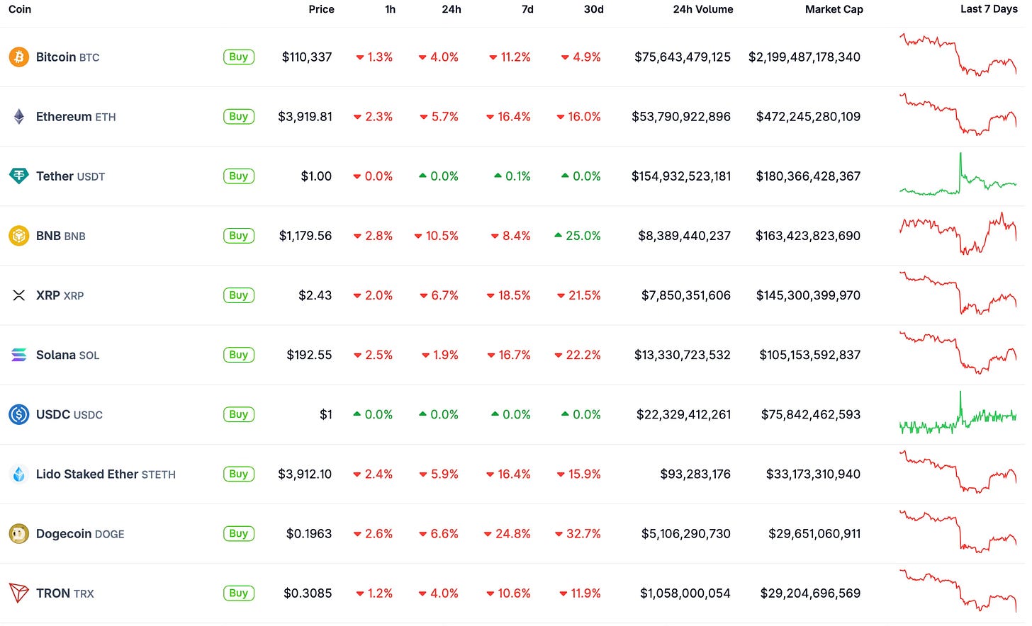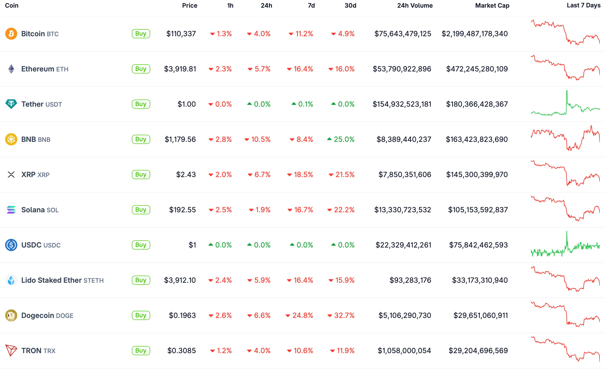 Nesta terça-feira (14), o mercado de criptomoedas teve seu pior desempenho desde a grande liquidação da semana passada. A maior queda ficou com a BNB, cuja perda superou 10%, e o Ethereum (ETH) caiu 5,7% e perdeu novamente o suporte de US$ 4.000. Já o preço do Bitcoin (BTC) saiu de US$ 115 mil para US$ 110 mil, uma queda de 4% nas últimas 24 horas.