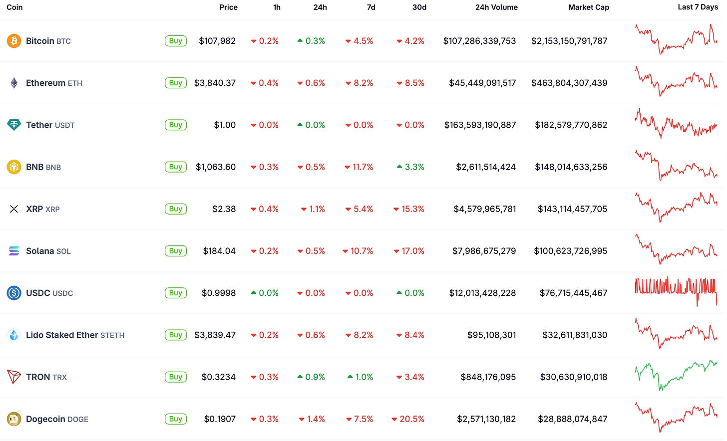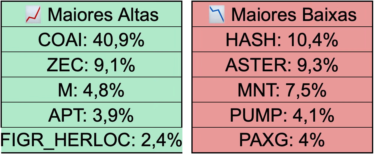 Mais uma vez o Bitcoin (BTC) devolveu ganhos após chegar nos US$ 110 mil. A criptomoeda recuou para US$ 107.982, mesmo após registrar um leve ganho de 0,3% nas últimas horas. Junto com o BTC, a Tron (TRX) subiu 0,9% e foi a única criptomoeda do Top 10 que registrou ganhos. A Dogecoin (DOGE) caiu 1,4% e o Ethereum (ETH) teve perda de 0,6%. No Top 100, a COAI voltou a se destacar e subiu 40%, mas as desvalorizações dominaram o dia – o token HASH caiu 10% e teve a maior perda.