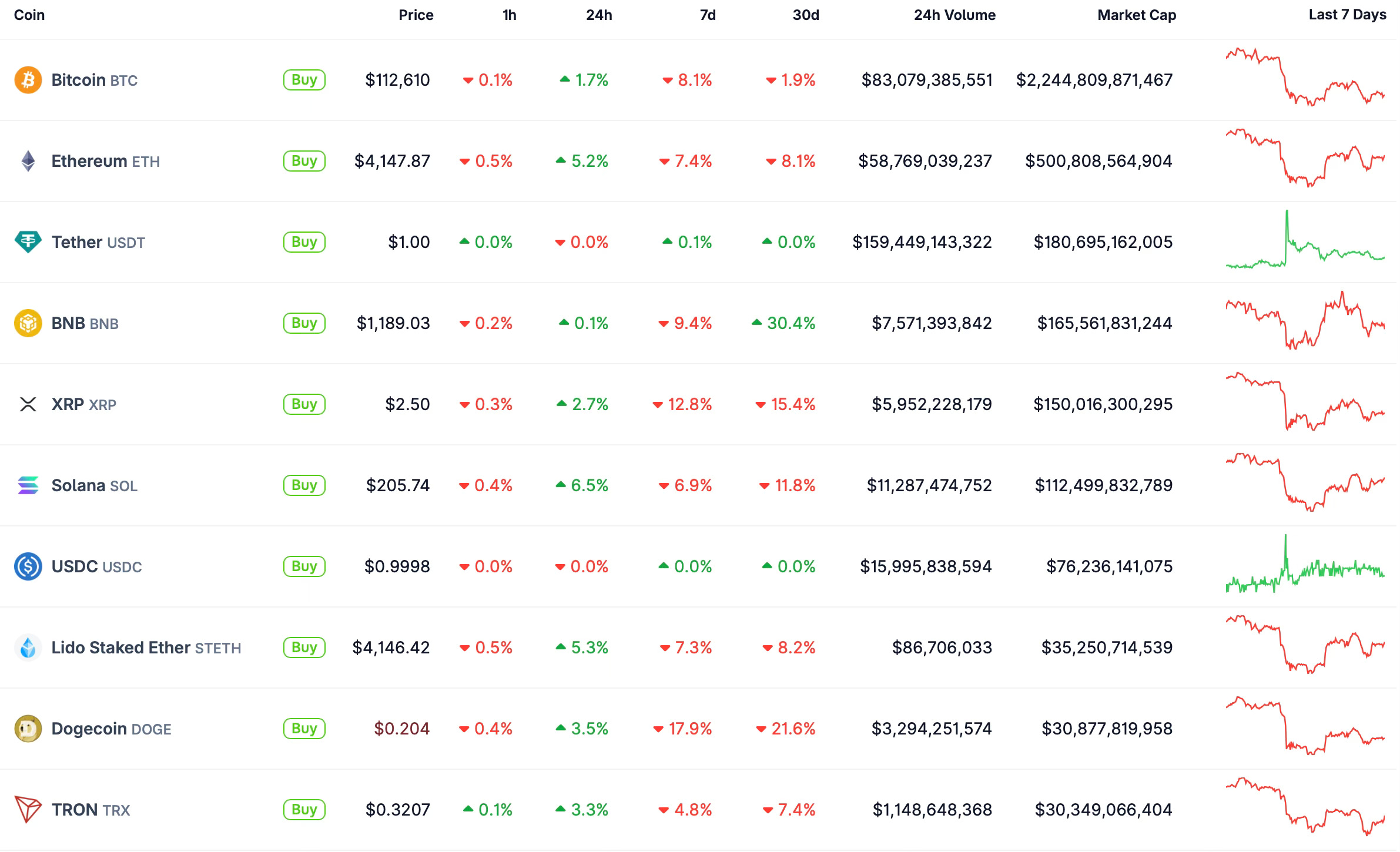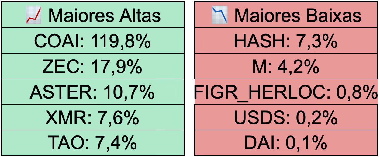 Após quatro dias de fortes quedas, o Bitcoin (BTC) teve alta de 1,7% e voltou a ficar acima de US$ 112 mil nesta quarta-feira (15). Quem liderou os ganhos do Top 10 foi a Solana (SOL), cujo preço subiu 6,5%, enquanto o Ethereum (ETH) se valorizou 5,2% e a Dogecoin (DOGE) subiu 3,5%. O token COAI disparou 119% e liderou de longe os ganhos do Top 100 e a HASH caiu 7,3%, registrando a maior perda do dia.