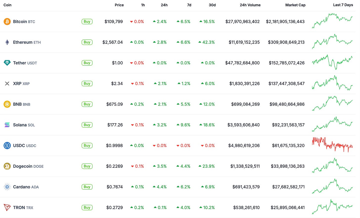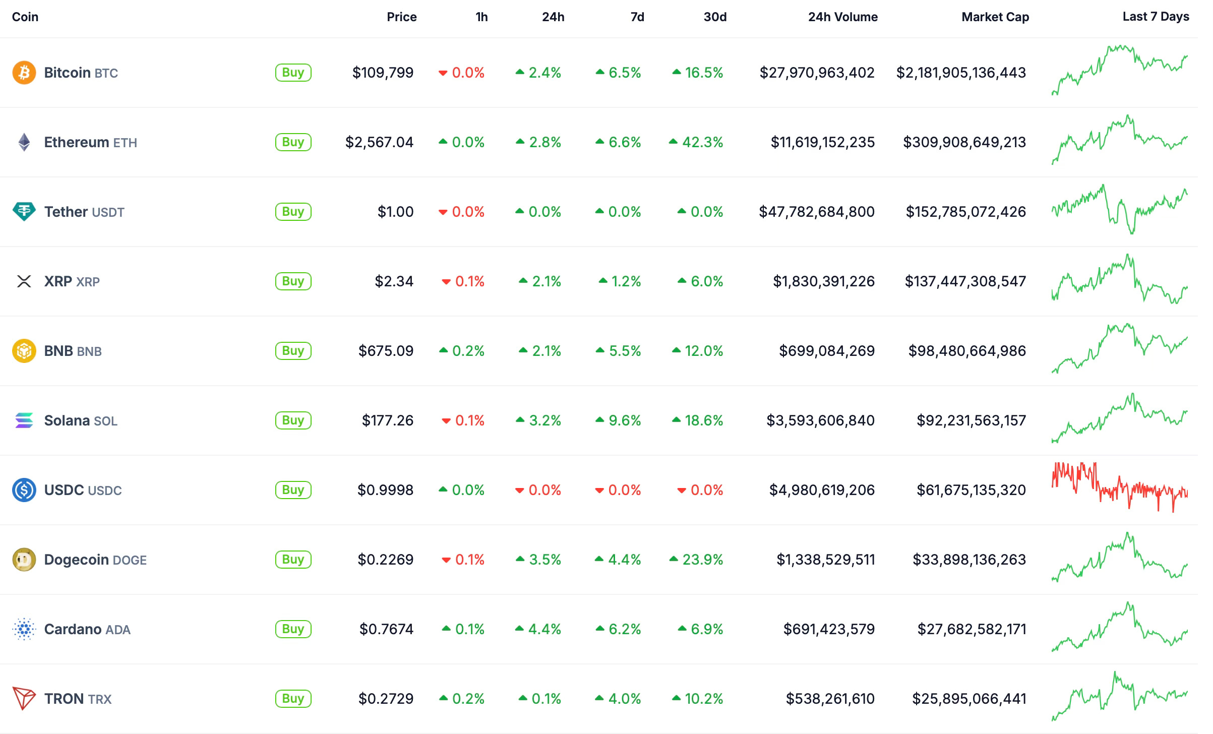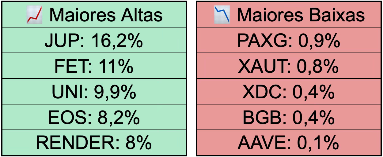 Depois de cair até US$ 106 mil durante o fim de semana, o Bitcoin (BTC) abriu em alta de 2,4% nesta segunda-feira (26). O preço voltou aos US$ 109 mil e pode buscar a renovação das máximas nesta semana. A Cardano (ADA) teve a maior alta do dia no Top 10 e se valorizou 4,4%.
