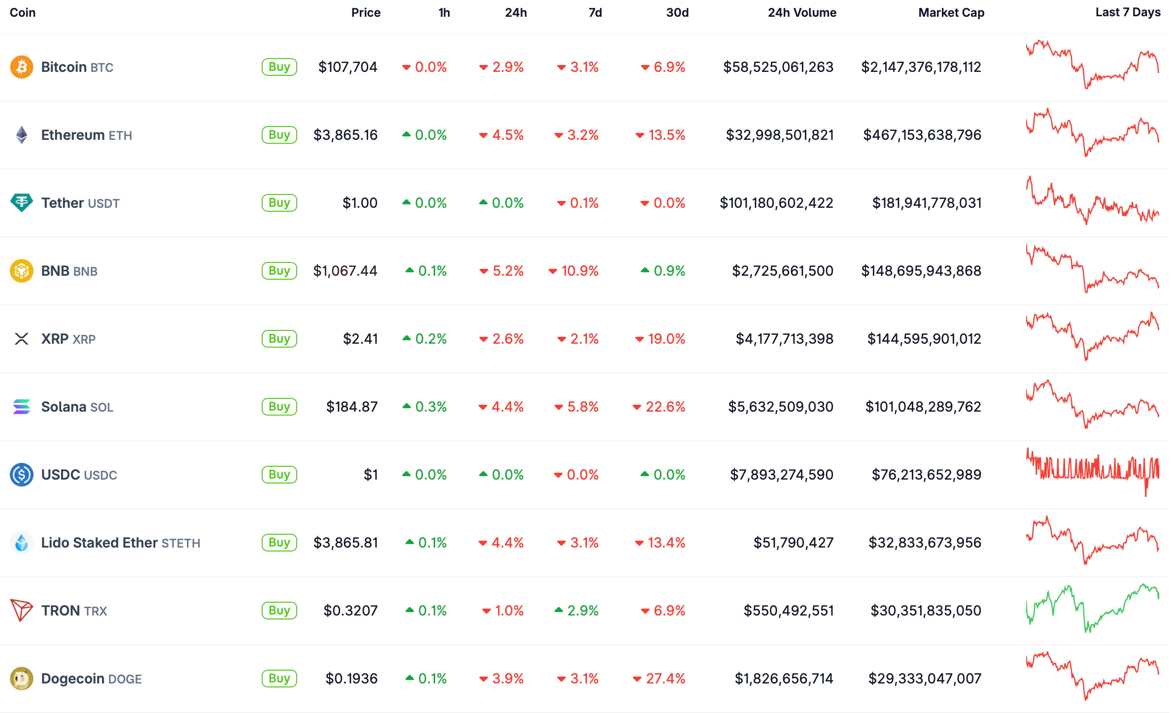O Bitcoin (BTC) entrou na sua fase “dia da marmota”, ou seja, sem grandes oscilações. Mais uma vez a criptomoeda não conseguiu se valorizar e caiu 2,9%, abrindo a terça-feira (21) valendo US$ 107.704. Isso fez todas as criptomoedas do Top 10 registrarem perdas, com destaque para a queda de 4,4% do Ethereum (ETH), que caiu abaixo de US$ 3.900, e da BNB, que se desvalorizou 5,2%.